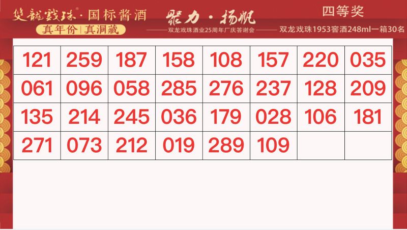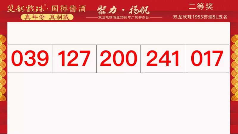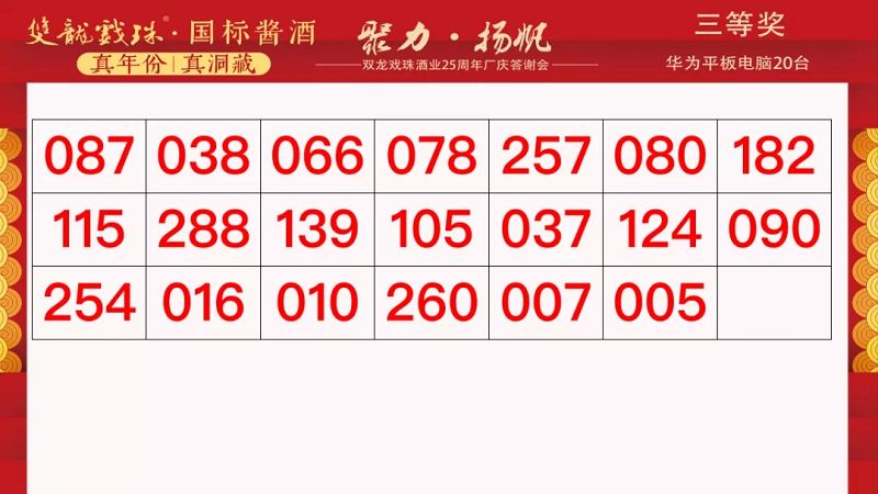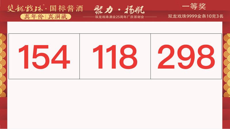 本場答謝宴共誕生特等獎(49999元現(xiàn)金)得主1位、一等獎(雙龍戲珠9999金條10克)得主3位、二等獎(5L雙龍戲珠1953洞藏窖酒)得主5位、三等獎(華為平板電腦壹臺)得主20位、四等獎(雙龍戲珠1953窖酒248ml壹箱)得主30名。