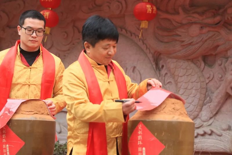 二月二,龍?zhí)ь^,是陽(yáng)氣回升,大地春回的日子,也是雙龍戲珠新一年釀酒季的開(kāi)始。每年立春后釀出的最早一批酒,稱為春釀,經(jīng)過(guò)一個(gè)冬天的低溫發(fā)酵,春釀?dòng)兄训钠焚|(zhì)。祭祀儀式后,雙龍戲珠酒業(yè)董事長(zhǎng)黃德鋒、總經(jīng)理黃盛堯等公司高管在雙龍壁前舉行封壇,將春釀封存洞藏,表達(dá)了對(duì)新一年的美好祝愿。