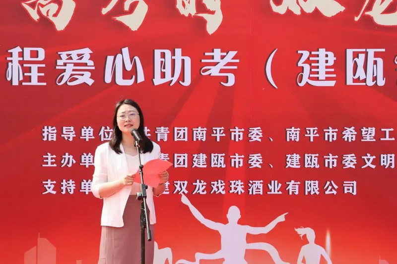 為給考生提供及時、周到的服務,讓考生安心赴考,6月5日,由南平團市委指導,建甌團市委、建甌市委文明辦、建甌市教育局聯(lián)合福建雙龍戲珠酒業(yè)有限公司舉辦“圓夢高考時 雙龍助騰飛”南平市希望工程愛心助考(建甌會場)集中宣傳活動在建甌市博物館新館前廣場順利舉行。南平團市委副書記王婷,建甌市委常委、組織部部長胡宗捷,建甌市委文明辦主任虞樂雄,建甌市教育局黨組書記、局長何華生,共青團建甌市委書記祝菁等單位主要領導,福建雙龍戲珠酒業(yè)有限公司副總經(jīng)理吳小如出席活動,建甌市青年志愿者和愛心司機代表約60余人參加本次活動。