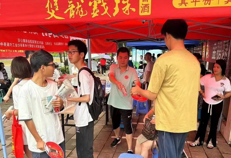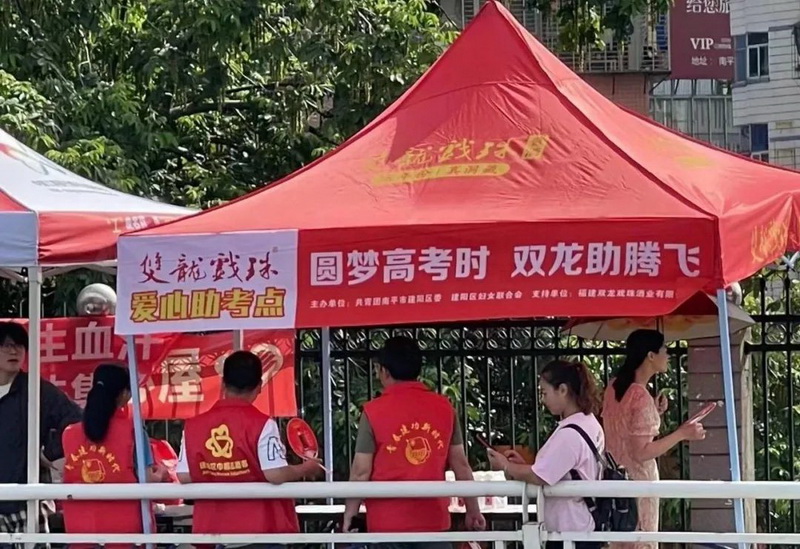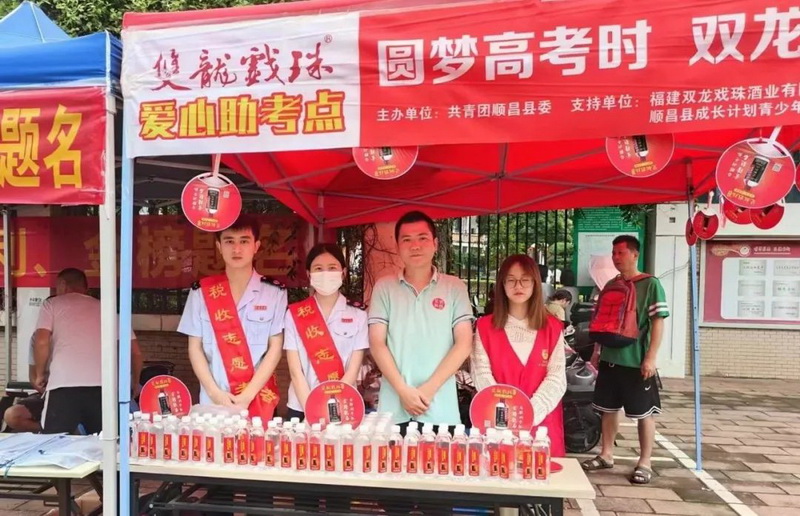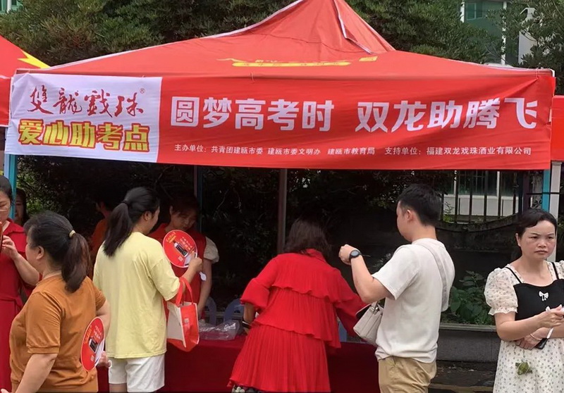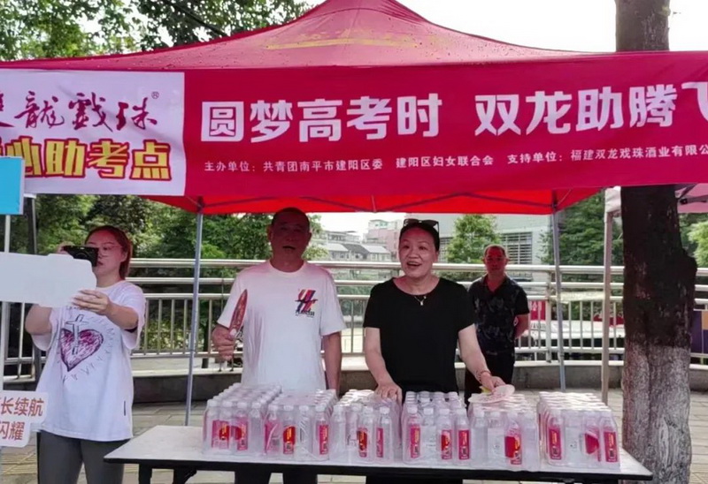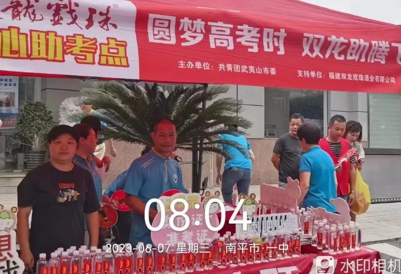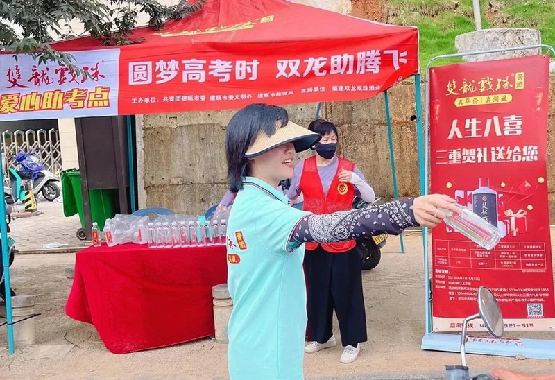 雙龍戲珠酒業(yè)在南平市各(縣、市)考點(diǎn)共設(shè)立12個愛心助考點(diǎn),提供免費(fèi)飲用水、扇子、防暑用品等物資,供考生和家長免費(fèi)領(lǐng)取。通過細(xì)致熱情的服務(wù),舒緩考生、家長緊張的心情,用行動詮釋“愛心助考”,為考生加油。