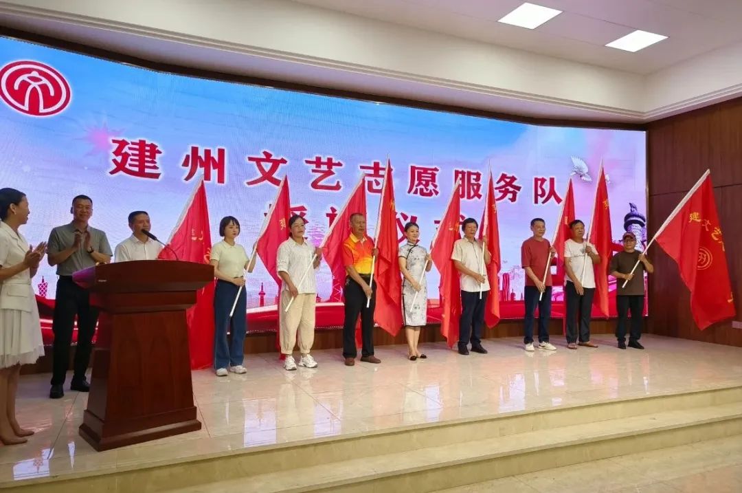由市委常委、宣傳部部長葉華,市委宣傳部副部長、文聯(lián)主席陳麗芝為建州文藝志愿服務(wù)隊授旗,書法協(xié)會、舞蹈協(xié)會、音樂協(xié)會、作家協(xié)會、攝影家協(xié)會、美術(shù)家協(xié)會、建州技藝團(tuán)、老來樂傳藝隊、奇石協(xié)會會長上臺接授隊旗。