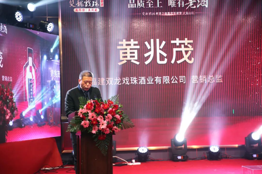 以酒為媒,齊聚一堂!12月1日,以“品質(zhì)至上 唯有老酒”為主題的雙龍戲珠老酒之夜貴賓答謝宴(武夷山站)在武夷山富貴武夷大酒店隆重舉行。福建雙龍戲珠酒業(yè)有限公司營銷總監(jiān)黃兆茂、武夷山拳擊貓酒水商行總經(jīng)理蔡世華出席活動并致辭。