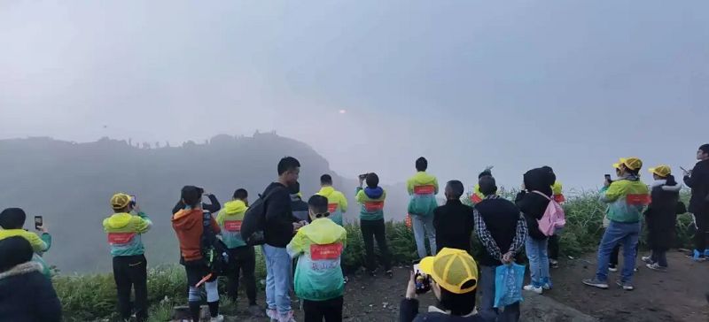 下午6時,登山隊成功登頂,并在山頂完成祈福活動?!奥窐巳蝿?、環(huán)保任務、祈福任務”順利完成